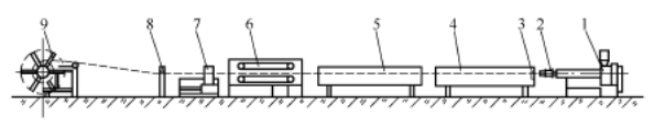 Praegu on PVC- ja PO-torud nii riigisiseselt kui ka rahvusvaheliselt suurima mahuga tooted.Joonis 1näitab polüolefiintorude (PO) tootmisprotsessi vooskeemi. Plastik juhitakse rõngakujulisse piluvormi (2) kruvi abil ühtlaselt plastifitseeritud sulatina, ekstrudeerides välja torutüki. See siseneb jahutamiseks ja suuruse määramiseks kohe kalibreerimisseadmesse (3), seejärel jahutatakse jahutuspaagis (4) täiendavalt piisavalt. Reguleeritava abil tõmmatakse toru ühtlase kiirusega väljamahaveoüksus(6)ja lõpuks lõigake lõikuriga (7) määratud pikkusteks. Õhukeseseinalisi torusid, mille läbimõõt on alla 160 mm, saab kerijaga (9) rullideks kerida.